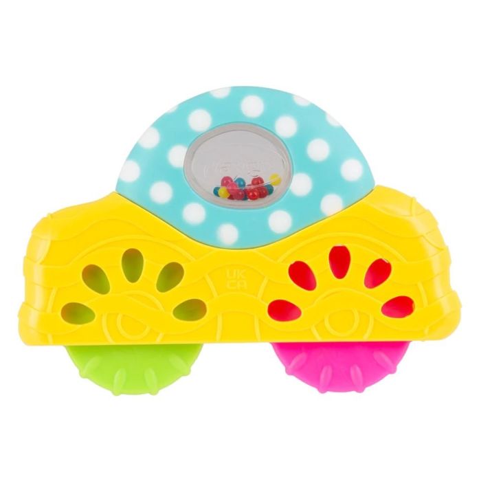 | Características | Sonaja con diseño de carrito colorido, se puede agitar para estimular la audición, incluye piezas para morder que alivian las encías, favorece la motricidad fina y la exploración táctil, colores brillantes que estimulan la percepción visual. |