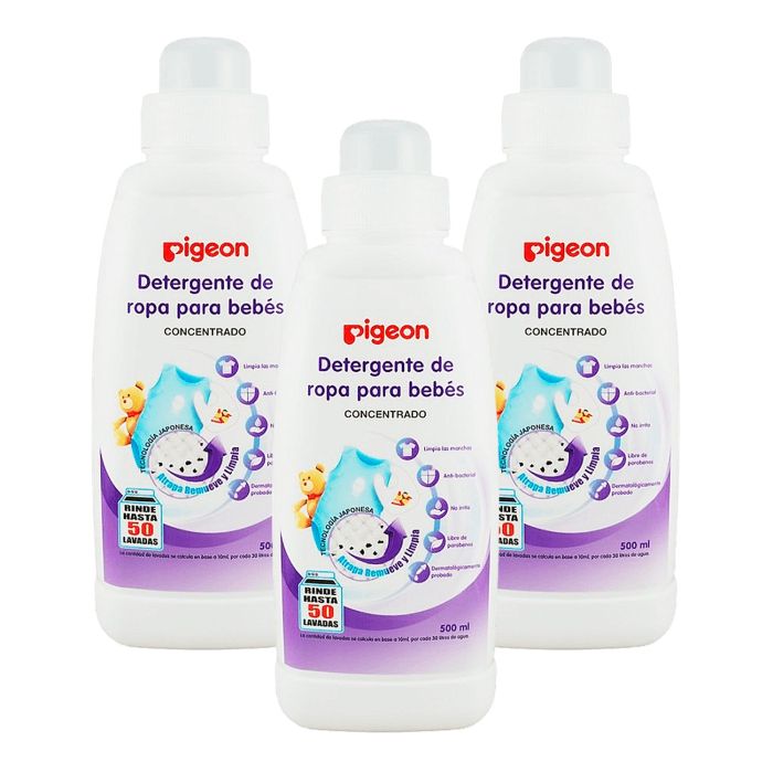 | Descripción | Detergente de ropa para bebés 500 ml x 3 un. El detergente de ropa líquido marca Pigeon limpia las manchas, es antibacterial, no irrita la piel, libre de parabenos, dermatológicamente formulado y bajo en espuma. |