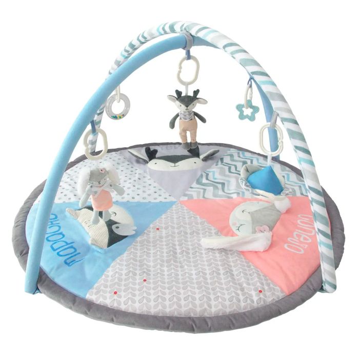 Este gimnasio incluye arcos flexibles y desmontables que sostienen cinco juguetes sensoriales, cada uno creado con texturas variadas, colores vibrantes y sonidos suaves que favorecen la curiosidad y el desarrollo de habilidades motoras. La combinación de estímulos visuales, táctiles y auditivos permite que tu bebé ejercite la coordinación mano-ojo y fomente la motricidad fina.