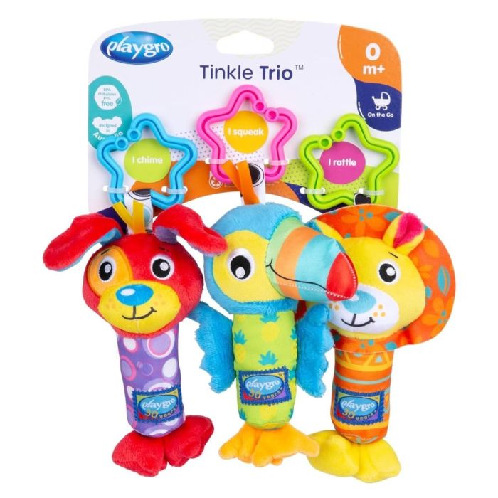 ¡Descubre el encantador Sonajero Trío Tinkle de Playgro! Este adorable conjunto de juguetes colgantes está diseñado especialmente para estimular los sentidos de tu bebé desde el nacimiento. Con colores brillantes y texturas variadas, el trío está compuesto por un perrito, un tucán y un león, cada uno con sonidos únicos como chirridos y campanillas que capturan la atención de tu pequeño.